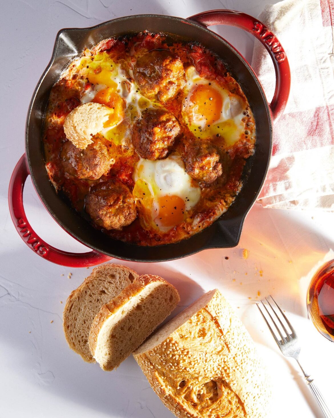 - Ρίχνουμε ανάμεσά τους τη σάλτσα και σπάμε τα αυγά «μάτια» (στα κενά ανάμεσα στα μπιφτέκια).