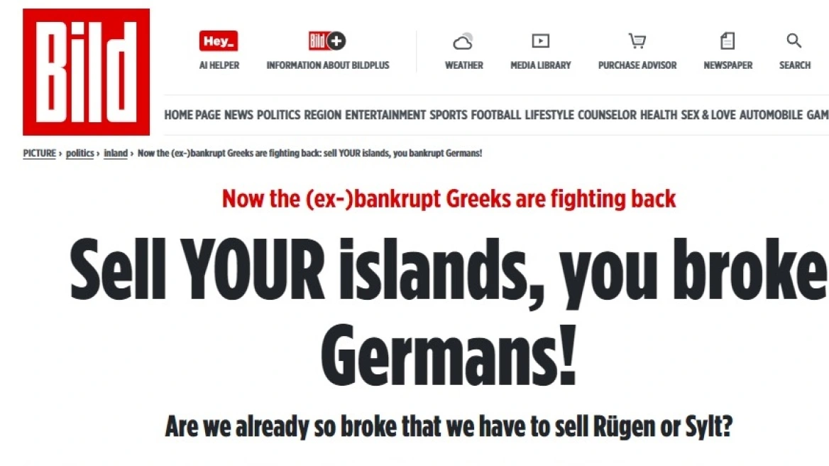 Με τίτλο «Οι (πρώην) χρεοκοπημένοι Έλληνες αντεπιτίθενται – Χρεοκοπημένοι Γερμανοί πουλήστε τα νησιά σας», η Bild – με αφορμή τη σημερινή κατάσταση στη Γερμανία – «θυμάται» τι έγραφε η ίδια το 2010 για τη χώρα μας, προσθέτοντας: «Δεν έλειψαν οι καλές συμβουλές από εμάς όταν η Ελλάδα χρεοκόπησε το 2010: “Γιατί δεν πουλάτε τα νησιά σας, χρεοκοπημένοι Έλληνες;” ήταν τότε ο τίτλος της Bild – και το εννοούσαμε σοβαρά!»