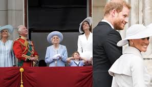 Το ζεύγος Σάσεξ δεν ήταν χθες στο Μπάκιγχαμ όταν η Βασίλισσα Ελισάβετ βγήκε στο μπαλκόνι του Παλατιού για να χαιρετήσει το πλήθος, ενώ δίπλα της στέκονταν ο πρίγκιπας Κάρολος, η Καμίλα Πάρκερ, ο πρίγκιπας Ουίλιαμ και η Κέιτ Μίντλετον με τα δύο παιδιά τους.