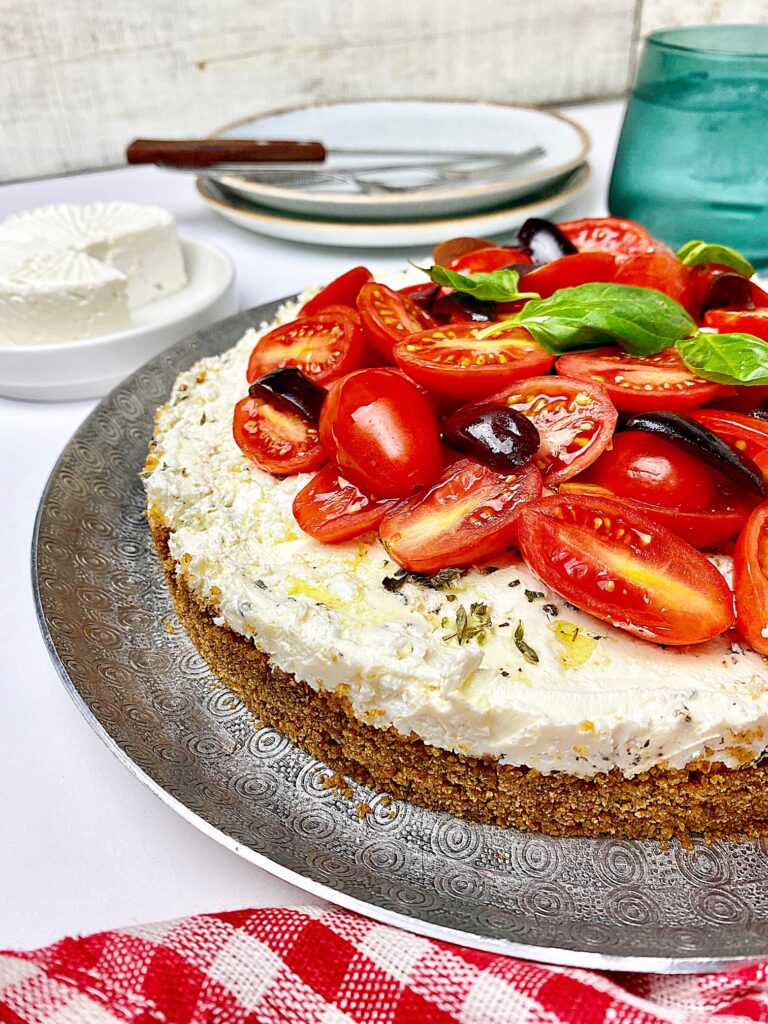 Αφήνετε το cheesecake να κρυώσει και να σταθεροποιηθεί καλά πριν το ξεφορμάρετε σε πιατέλα. Σερβίρετε στολίζοντας με ντοματίνια, ελίτσες και φυλλαράκια ρίγανης.