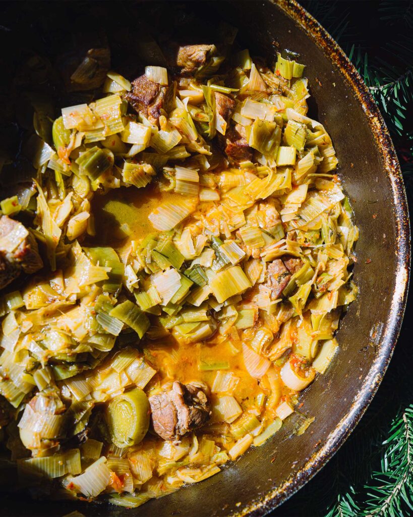 - Συνεχίζουμε με τον ίδιο τρόπο, με τακτικές προσθήκες βραστού νερού, σαν να ετοιμάζουμε ριζότο, μέχρι να μαλακώσουν καλά τόσο το κρέας όσο και το πιο σκληρό μέρος από τα πράσα. Η διαδικασία διαρκεί 1 ώρα ή και περισσότερο.