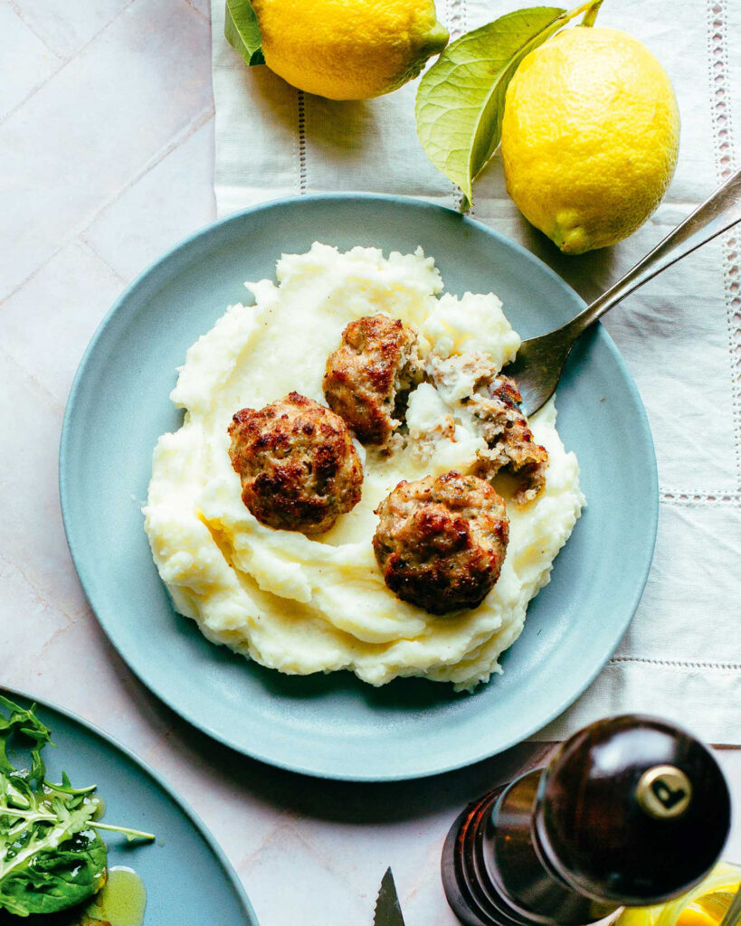 - Συνοδεύουμε τους πικάντικους χοιρινούς κεφτέδες με αφράτο πουρέ.