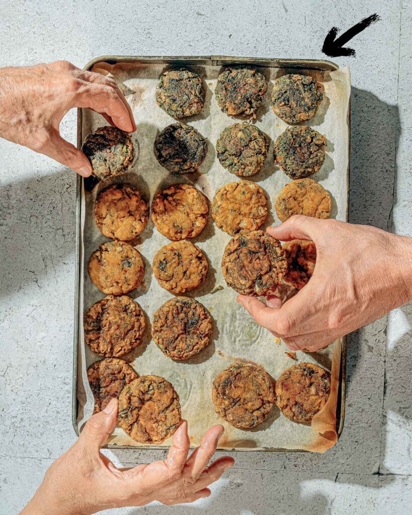 - Πλάθουμε με το μείγμα περίπου 18 κεφτέδες, βάρους 40 γρ. ο καθένας, και τους πιέζουμε για να πλατύνουν λίγο.