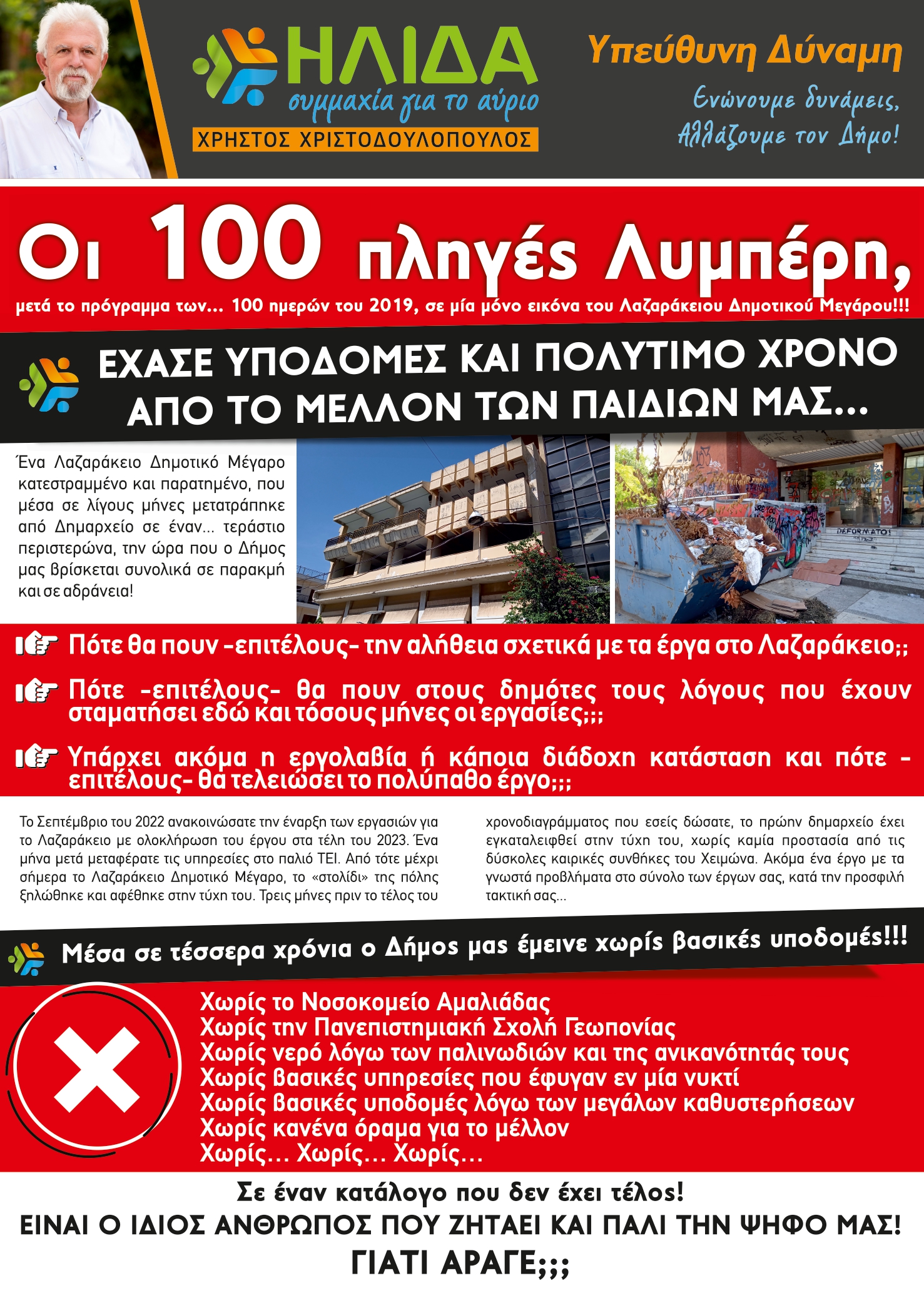 «Ήλιδα – Συμμαχία για το Αύριο»: Οι τραγικές ευθύνες Λυμπέρη για την κατάσταση στο Λαζαράκειο Δημοτικό Μέγαρο Αμαλιάδας