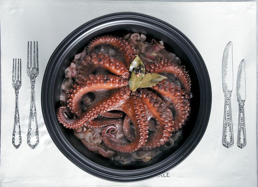 Ένα χταπόδι που πρώτα μαγειρεύεται στο ζουμί του και μετά με κρασί, ξύδι και μυρωδικά.