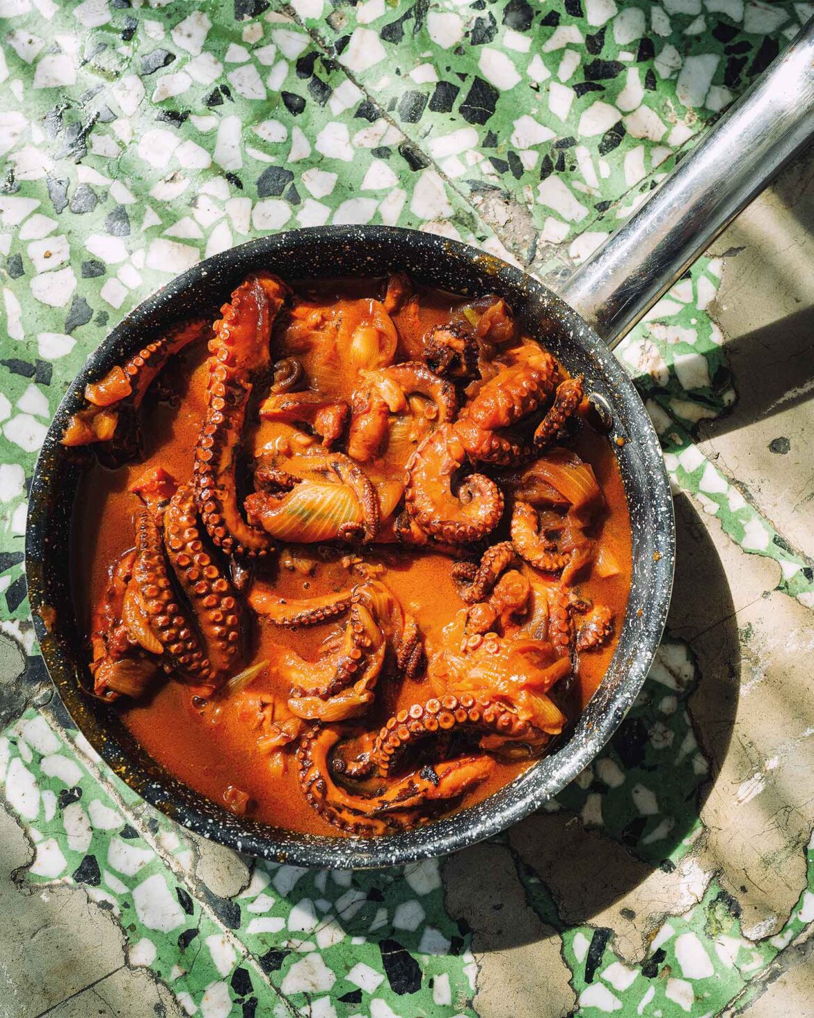 - Χαμηλώνουμε λίγο τη φωτιά και προσθέτουμε τα πλοκάμια. Σοτάρουμε για άλλα 5 λεπτά, ανακατεύοντας, και προσθέτουμε νερό τόσο ώστε να καλύψει τα υλικά, ξύνοντας με ξύλινη σπάτουλα τον πάτο της κατσαρόλας για να διαλυθούν στο υγρό τα νόστιμα καμένα μέρη του πελτέ.