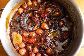 Σε μια βαθιά κατσαρόλα ρίχνουμε το λάδι να ζεσταθεί, προσθέτουμε το σκόρδο και το σοτάρουμε, ενώ στη συνέχεια ρίχνουμε και τα ΟΜΟΣΠΟΝΔΙΑ Κρεμμυδάκια Στιφάδο και τα ανακατευύουμε καλά, ώστε να βγάλουν τα αρώματά τους. Ρίχνουμε τον Τοματοπολτό Μονής Συμπύκνωσης ΟΜΟΣΠΟΝΔΙΑ, τον τρίβουμε στη βάση της κατσαρόλας με ξύλινη κουτάλα να διαλυθεί και σβήνουμε με το ξίδι. Αφήνουμε να εξατμιστεί και προσθέτουμε όλα τα υπόλοιπα υλικά εκτός από το χταπόδι.