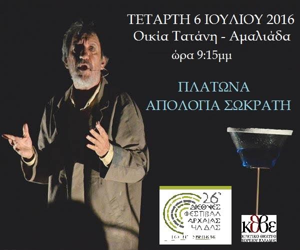 To 26o Διεθνές Φεστιβάλ Αρχαίας Ήλιδας συνεχίζει το ταξίδι του με την παράσταση «Πλάτωνα, Απολογία Σωκράτη», στην αρχαία ελληνική γλώσσα, που ξεκίνησε πέρσι με τη συνεργασία και υπό την αιγίδα του ΚΘΒΕ, μετά την ενθουσιώδη και κατανυκτική της υποδοχή από το κοινό κάθε ηλικίας και παιδείας, συνεχίζεται και φέτος με μεγάλη περιοδεία ανά την Ελλάδα αλλά και το εξωτερικό, κατόπιν της απρόβλεπτης επιτυχίας της στην Ρουμανία( Εθνικά Θέατρα Βουκουρεστίου και Κραϊόβας), και την τιμητική πρόσκληση να παιχθεί φέτος στην ιστορική Όπερα του Ανόι(Βιετνάμ) την 25η Μαρτίου, ημέρα της εθνικής μας εορτής, για το Διεθνές Διπλωματικό Σώμα.