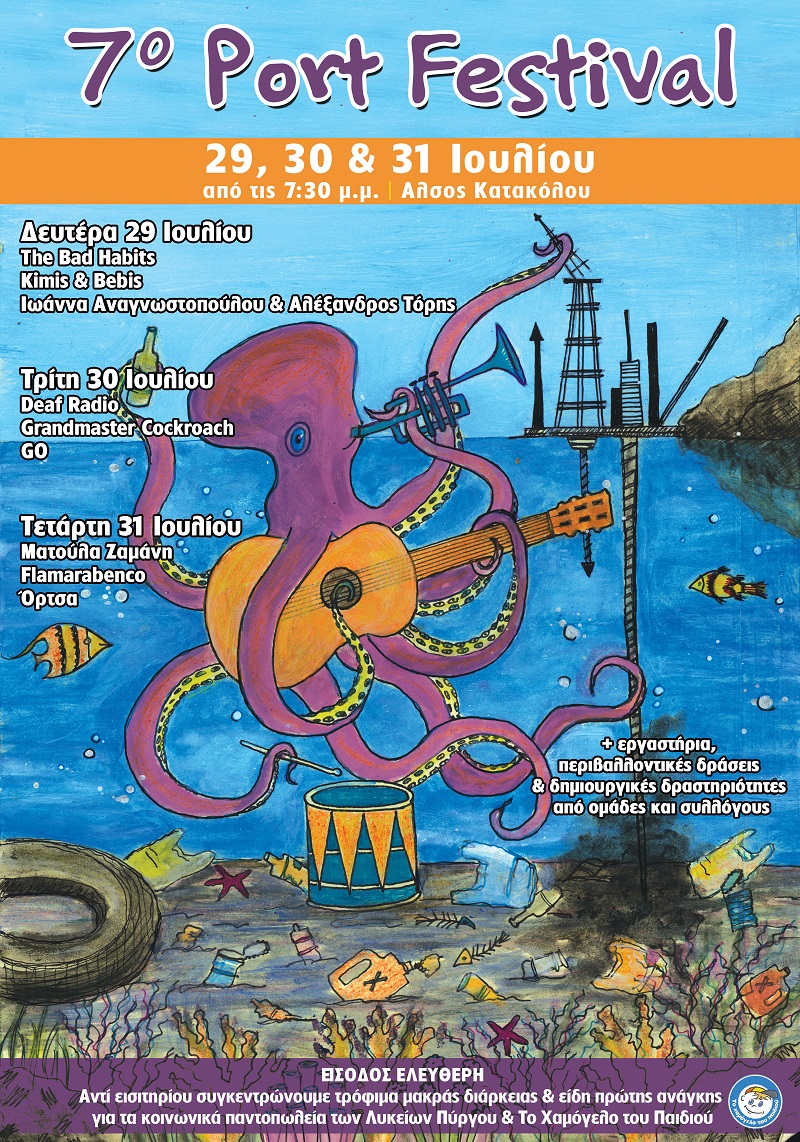 Έφτασε η στιγμή για να ζωντανέψει και πάλι το αλσύλιο Κατακόλου με μουσικές, φωνές και χαμόγελα και να δώσει πνοή στο μαραζωμένο Κατάκολο της κρουαζιέρας και της εγκατάλειψης! Με εργαστήρια και δημιουργικές δραστηριότητες για μικρούς και μεγάλους ξεκινά το τριήμερο 7ο Port Festival το απόγευμα της Δευτέρας 29 Ιουλίου, από τις 7:30μ.μ., ενώ οι μουσικές αρχίζουν να ηχούν από τις 9μ.μ.