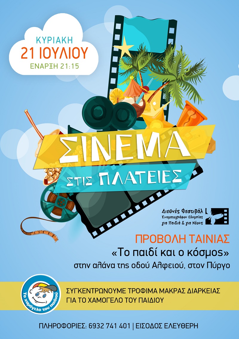 Στο πλαίσιο του προγράμματος “Σινεμά στις πλατείες”, που υλοποιεί για ένα ακόμα καλοκαίρι το Διεθνές Φεστιβάλ Κινηματογράφου για Παιδιά και Νέους Ολυμπίας, την Κυριακή 21 Ιουλίου στην “Αλάνα” της οδού Αλφειού, θα προβληθεί η ταινία «Το Αγόρι και ο κόσμος» («O Menino e Mundo»), του Βραζιλιάνου Άλε Αμπρέου…
