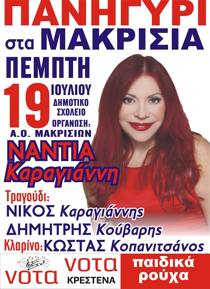 Ο χώρος θα είναι στο Δημοτικό σχολείο Μακρισίων και οι διοργανωτές υπόσχονται μια εξαιρετική βραδιά για όλους με εκλεκτό επιτελείο λαικής μουσικής και με προεξάρχουσα την Νάντια Καραγιάννη (τραγούδι Νίκος Καραγιάννης – Δημήτρης Κούβαρης, κλαρίνο Κώστας Κοπανιτσάνος).