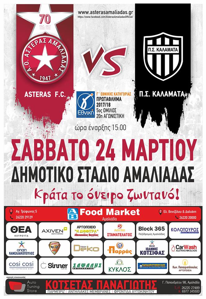Το Σάββατο 24 Μαρτίου στις 3.00 μ.μ., όλοι στο γήπεδο, κοντά στην προσπάθεια του Αστέρα μας απέναντι στην Καλαμάτα.