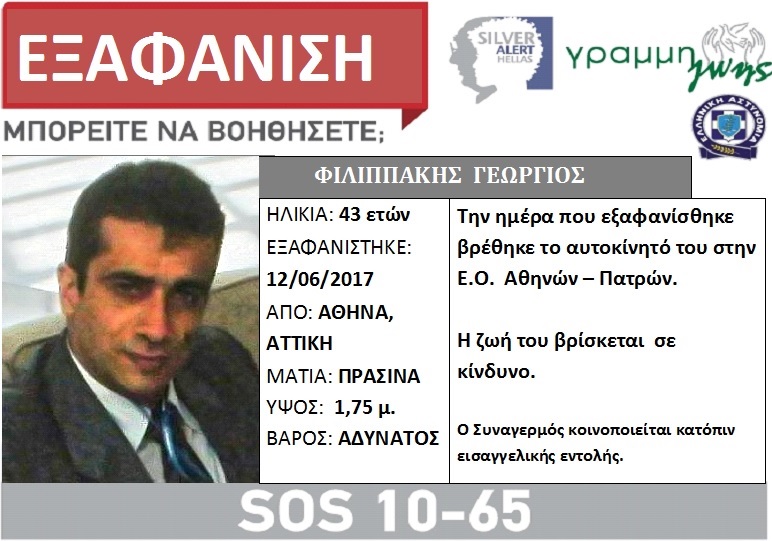 Τα στοιχεία και τη φωτογραφία του 43χρονου γιατρού Γιώργου Φιλιππάκη από την Αθήνα του οποίου τα ίχνη εξαφανίστηκαν την περασμένη Δευτέρα έδωσαν στη δημοσιότητα μέσω της γραμμής ζωής silver alert οι συγγενείς του.