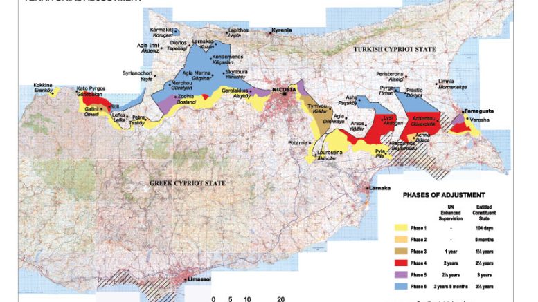 Η ελληνοκυπριακή πλευρά κατέθεσε χάρτη στις συνομιλίες της Γενεύης με τον οποίο πρτείνει το το υπό τουρκοκυπριακή διοίκηση τμήμα να να είναι στο 28,2% των εδαφών του νησιού, ποσοστό που είναι κατά μισή ποσοστιαία μονάδα μικρότερο από το σχέδιο Ανάν. Ο χάρτης, σύμφωνα με πληροφορίες, περιλαμβάνει μεταξύ άλλων τις εξής περιοχές: Μόρφου, Κυθρέα, Άσσια, Βατυλή, Λύση και Κοντέα.