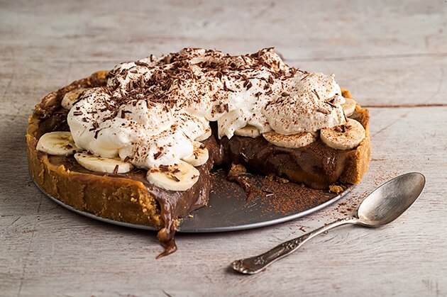 Ξεφορμάρουμε το banoffee. Στρώνουμε φέτες μπανάνας σε όλη την επιφάνεια γαρνίρουμε με την χτυπημένη παχύρρευστη κρέμα και πασπαλίζουμε ξύσμα σοκολάτας και κακάο. Απόλαυση χωρίς τέλος!