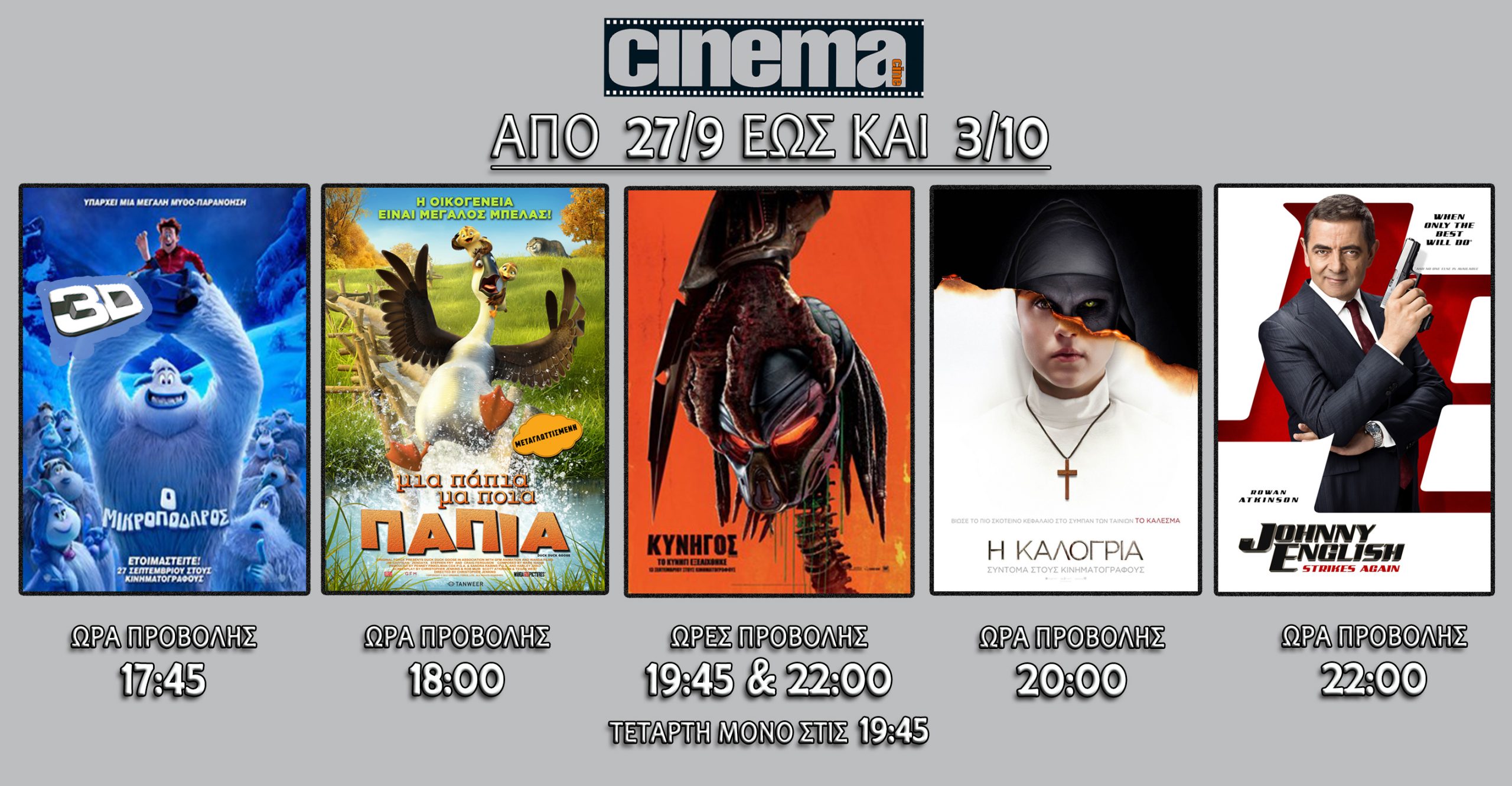 1.“Ο ΜΙΚΡΟΠΟΔΑΡΟΣ (3D)”–>17:45Η ταινία «Ο Μικροπόδαρος» φέρνει τα πάνω κάτω σε όλα όσα ξέρουμε για τα Γέτι, όταν ένα νεαρό και έξυπνο Γέτι ανακαλύπτει κάτι που πίστευε πως δεν υπήρχε – έναν άνθρωπο. Τα νέα για τον «Μικροπόδαρο» του φέρνουν δόξα και μια ευκαιρία να κερδίσει το κορίτσι των ονείρων του. Επίσης, αναστατώνει την κοινότητα των Γέτι για το τι άλλο θα μπορούσε να υπάρχει στον κόσμο πέρα από το χιονισμένο τους χωριό, σε μια ζωηρή περιπέτεια για τη φιλία, το κουράγιο και την χαρά της ανακάλυψης.2.“ΜΙΑ ΠΑΠΙΑ ΜΑ ΠΟΙΑ ΠΑΠΙΑ”–>18:00Δύο ορφανά παπάκια, η δυναμική, μόλις 16 ημερών Τσι και ο μικρότερος αδελφός της Τσάο, αποχωρίζονται από το σμήνος τους κατά λάθος εξαιτίας του φιγουρατζή ιπτάμενου Πενγκ, μιας αρσενικής χήνας που είναι ελεύθερο πνεύμα, ένας εργένης που προτιμά χίλιες φορές τα παράτολμα εναέρια ακροβατικά, αντί να συμμετέχει στις προετοιμασίες των υπολοίπων για την ετήσια μετανάστευση Τα φοβισμένα παπάκια ζητάνε τη βοήθεια του Πενγκ για να επιστρέψουν στο σμήνος τους. Εκείνος αρνείται, αλλά ένας τραυματισμός στη φτερούγα του τον αναγκάζει να αλλάξει γνώμη. Οι τρεις τους θα ζήσουν μια μοναδική περιπέτεια, με εμπόδια και δυσκολίες που θα τους φέρει όμως πραγματικά κοντά. Ο Πενγκ αποδεικνύεται τελικά η καλύτερη πατρική φιγούρα που θα μπορούσαν να έχουν αυτά τα δύο ορφανά παπάκια!3.“ΚΥΝΗΓΟΣ”–>19:45 & 22:00 (ΤΕΤΑΡΤΗ ΜΟΝΟ ΣΤΙΣ 19:45)Από τα πιο μακρινά σημεία του διαστήματος στους μικρούς δρόμους των προαστίων, το κυνήγι επιστρέφει στο σπίτι του μέσα από την εκρηκτική επαναφορά της κινηματογραφικής σειράς «Κυνηγός» του Σέιν Μπλακ. Τώρα, οι πιο θανάσιμοι κυνηγοί του σύμπαντος είναι πιο δυνατοί, πιο έξυπνοι και πιο φονικοί από ποτέ, έχοντας εξελιχθεί γενετικά με DNA από άλλα είδη. Όταν ένα νεαρό αγόρι προκαλέσει κατά λάθος την επιστροφή τους στη Γη, μόνο μια ετερόκλητη ομάδα πρώην στρατιωτών και ένας θυμωμένος καθηγητής επιστημών θα μπορέσουν να εμποδίσουν το τέλος του ανθρώπινου είδους.