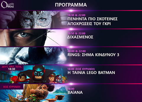 Το ΗΛΕΙΑ ΟΙΚΟΝΟΜΙΑ χαρίζει τέσσερα (4) εισιτήρια του κινηματογράφου “ΟΡΦΕΑ” γιά τις παραστάσεις αυτής της εβδομάδας. Το ένα εισιτήριο είναι για την ταινία “Rings¨Σήμα κινδύνου 3”, το άλλο εισιτήριο για την ταινία “Πενήντα αποχρώσεις του γκρί”. το τρίτο για την ταινία “Η ταινία lego Batman” και για την ταινία “Βαιάνα”.