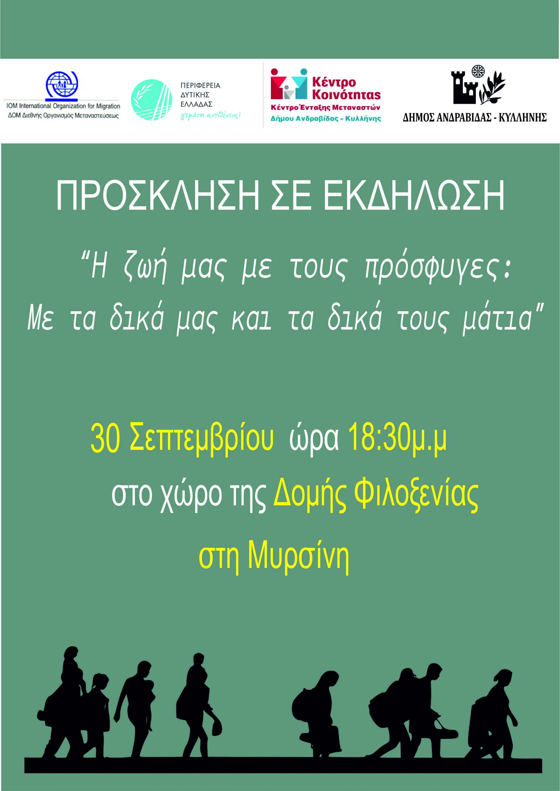 Η Περιφέρεια Δυτικής Ελλάδας σε συνεργασία με τον Δήμο Ανδραβίδας-Κυλλήνης, τη Δομή Φιλοξενίας Προσφύγων και το Κέντρο Κοινότητας -Κέντρο Ένταξης Μεταναστών οργανώνουν εκδήλωση την Κυριακή 30 Σεπτεμβρίου και ώρα 18:30 στη Δομή φιλοξενίας των Προσφύγων στη Μυρσίνη.