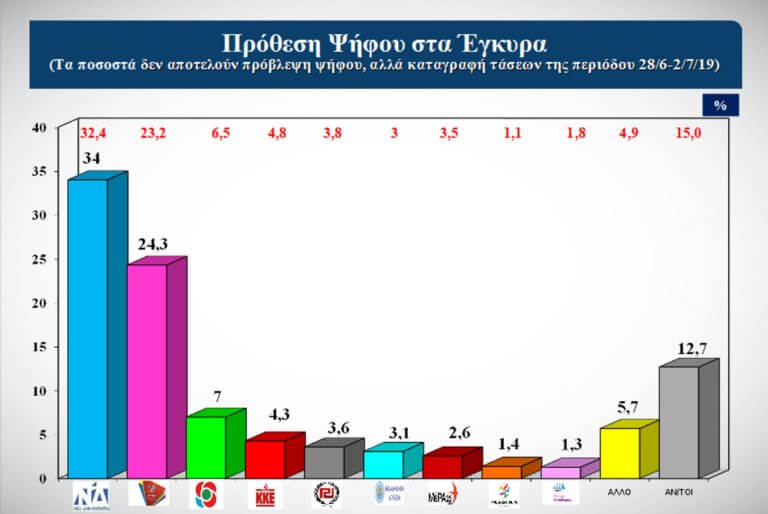 Συγκεκριμένα η ΝΔ προηγείται με 34%, ο ΣΥΡΙΖΑ ακολουθεί με 24,3%, το ΚΙΝΑΛ έχει 7%, το ΚΚΕ 4,3%, η Χρυσή Αυγή 3,6%, η Ελληνική Λύση 3,1% και το ΜεΡΑ 25 έχει 2,6%.