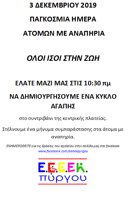 Γι’ αυτό το σκοπό τιμούμε την παγκόσμια Ημέρα Ατόμων με Αναπηρία ώστε να υπάρξει ευαισθητοποίηση και να επέλθει η βελτίωση της ποιότητας ζωής των ατόμων με αναπηρία μέσω της προώθησης των μεταρρυθμίσεων εκείνων που θα λειτουργήσουν ως στυλοβάτης στην προώθηση του οράματος της κοινωνικής ενσωμάτωσης και αποδοχής τους. Αυτή είναι και η βασική επιδίωξη του σχολείου μας του ΕΕΕEΚ Πύργου, το οποίο έχει αγκαλιάσει τους μαθητές που εμφανίζουν περιορισμό λόγου, έργου ή άμεσης αντίληψης, που προκύπτουν ως απόρροια οργανικών ή περιβαλλοντολογικών αιτιών και έχουν ως αντίκτυπο να προκαλούν πληθώρα προσκομμάτων στην αυτοεξυπηρέτηση, την απασχόληση, την εκπαίδευση, την ψυχαγωγία και την γενικότερη κοινωνική συμμετοχή.