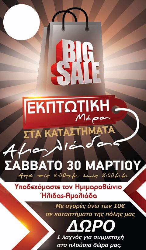 Μια ακόμα δράση ετοιμάζει ο Εμπορικός Σύλλογος Ήλιδας, για το Σάββατο 30 Μαρτίου. Στο πλαίσιο του 5ου Μαραθωνίου Ολυμπίας και επ’ ευκαιρίας της διαδρομής Ήλιδα – Αμαλιάδα, θα πραγματοποιηθεί στην πόλη η «Εκπτωτική Ημέρα». Τα καταστήματα θα παραμείνουν ανοιχτά από τις 8.00 το πρωί έως τις 8.00 το βράδυ και θα προσφέρουν στους καταναλωτές προϊόντα ποιότητας και σε πολύ καλές τιμές.