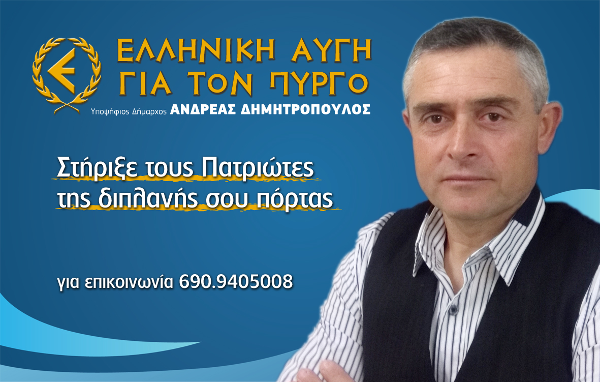 “Είμαστε στην ευχάριστη θέση να ανακοινώσουμε στους χιλιάδες υποστηρικτές και φίλους της ΧΡΥΣΗΣ ΑΥΓΗΣ στην Ηλεία, ότι θα συμμετέχουμε στις δημοτικές εκλογές του Πύργου, με τον λαϊκό αγωνιστή ΑΝΔΡΕΑ ΔΗΜΗΤΡΟΠΟΥΛΟ ως επικεφαλής του συνδυασμού «ΕΛΛΗΝΙΚΗ ΑΥΓΗ ΓΙΑ ΤΟΝ ΠΥΡΓΟ».