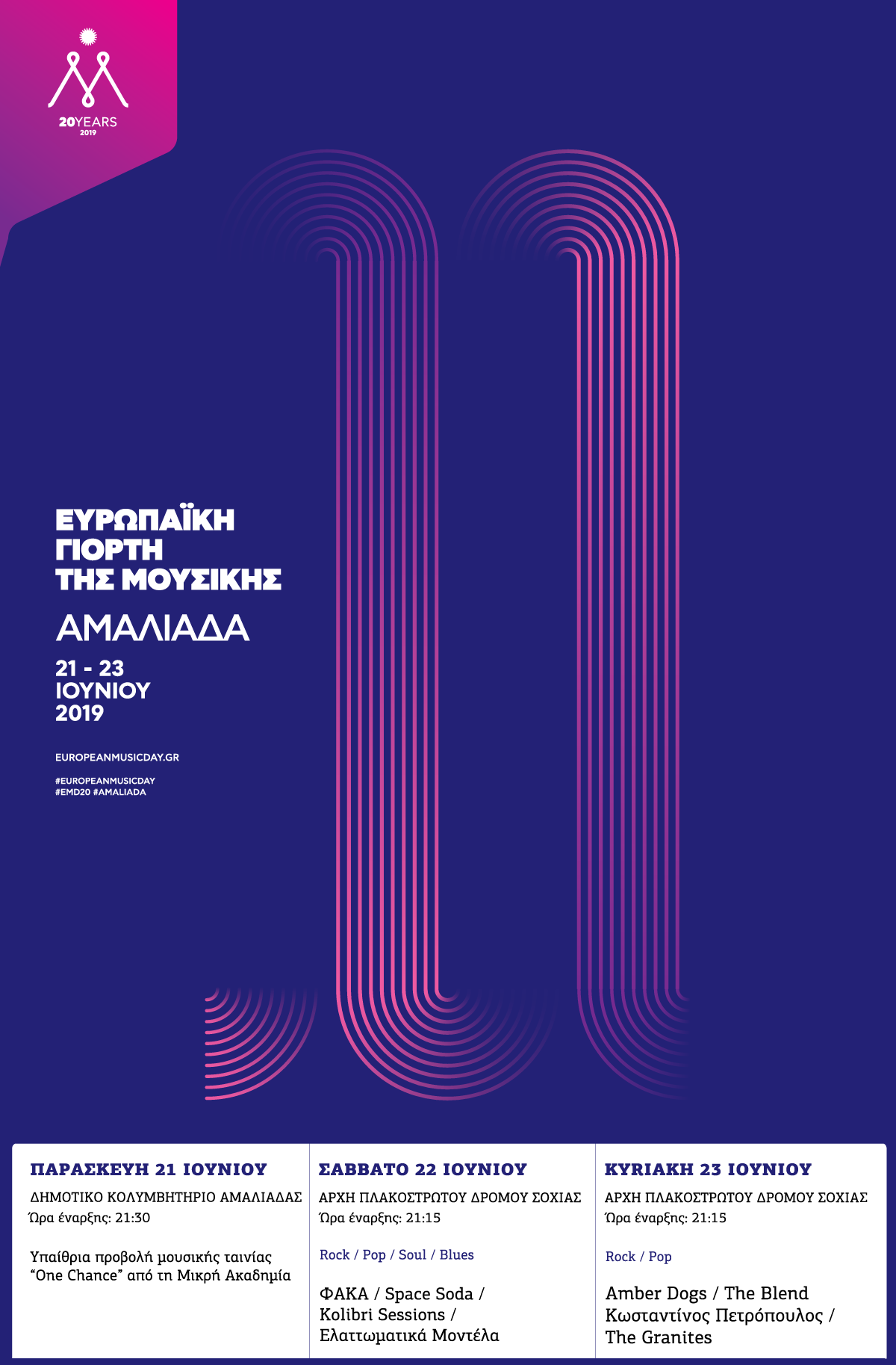 Στην Αμαλιάδα για 8η χρονιά η διοργάνωση στης Ευρωπαϊκής Γιορτής της Μουσικής απευθύνει ένα ηχηρό κάλεσμα που σας προτρέπει να αφήσετε στην άκρη την καθημερινότητα και να αφεθείτε στους ρυθμούς της καρδιάς και στη δύναμη της μουσικής!