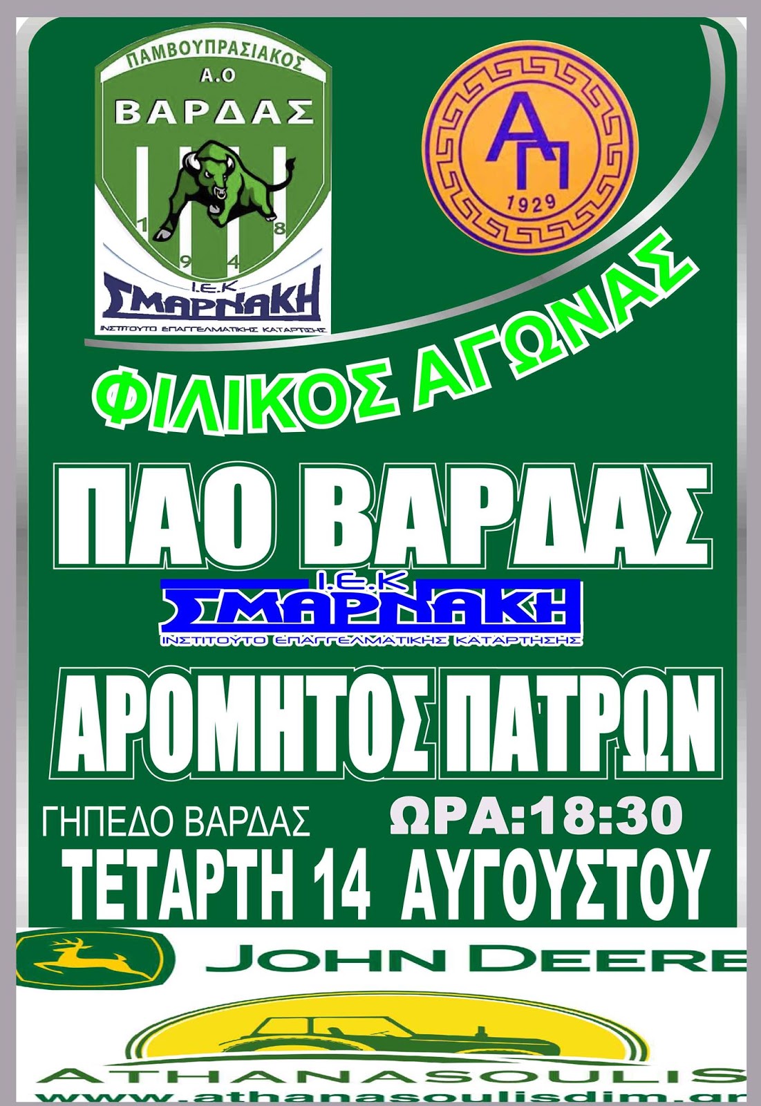 Με την προετοιμασία να συνεχίζεται στο πρώτο στάδιο της, ο ΠΑΟ Βάρδας θα δώσει και το πρώτο φιλικό ματς την Τετάρτη (14/8) με τον Ατρόμητο Πατρών τον οποίο θα υποδεχθεί στο “Γρ. Καλάκος” στις 6.30 το απόγευμα.
