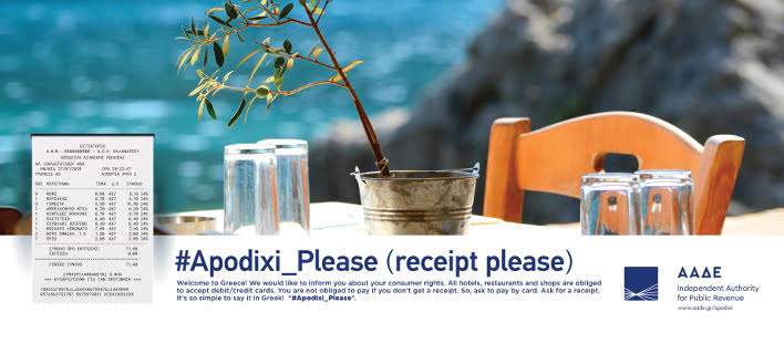Αυτή είναι η λογική της καμπάνιας που ξεκίνησε η ΑΑΔΕ με ονομασία «Apodixi please», με στόχο να ενημερώσει τους τουρίστες για τα δικαιώματα τους αλλά και για τα κόλπα που χρησιμοποιούν επιτήδειοι στη χώρα μας, προκειμένου να κλέψουν την εφορία. Το ενθαρρυντικό είναι ότι ειδικά οι Ευρωπαίοι επισκέπτες δείχνουν ιδιαιτέρως ευαισθητοποιημένοι στο θέμα της φοροδιαφυγής και φαίνεται να γνωρίζουν το πρόβλημα με τις αποδείξεις στη χώρα μας.