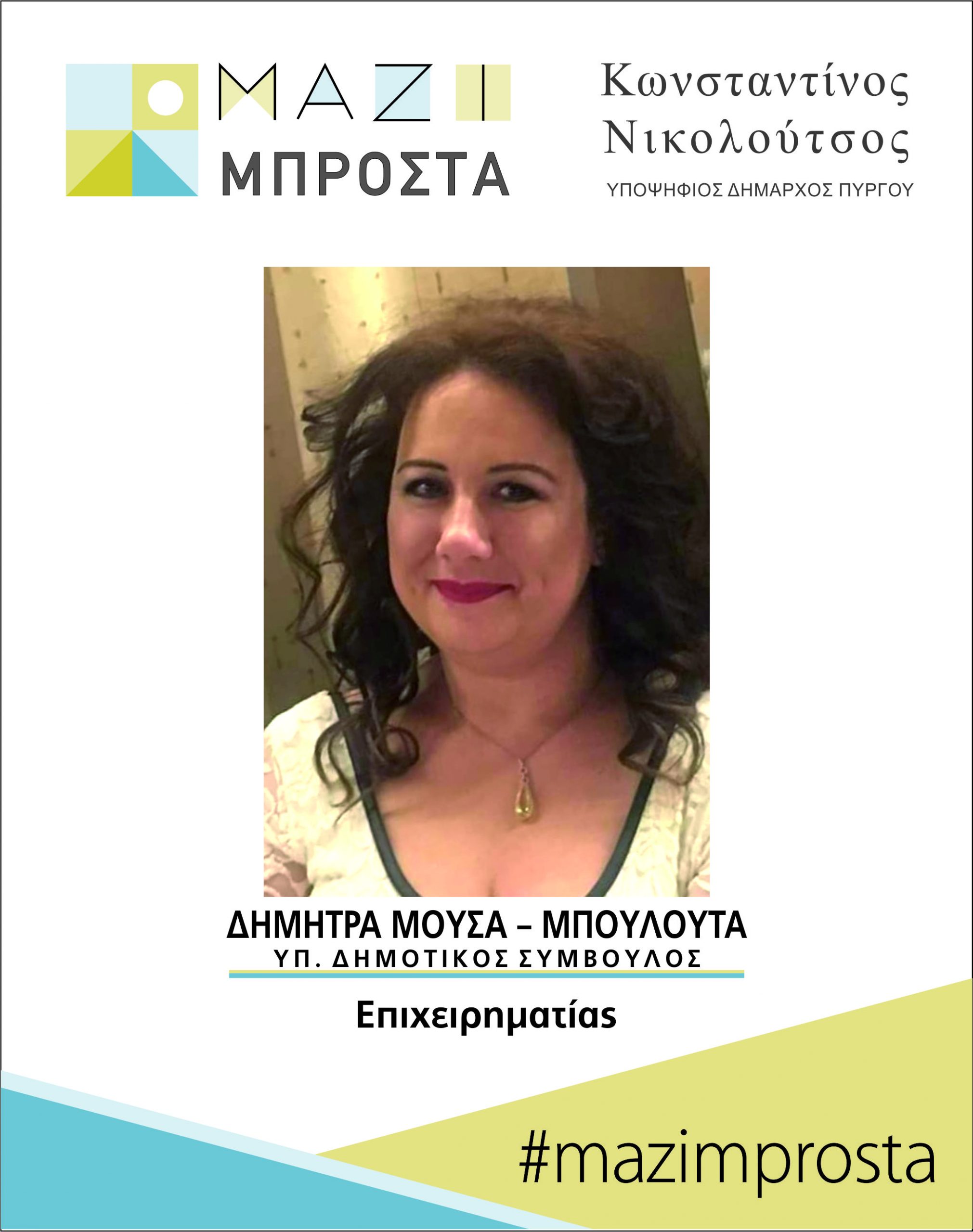 Η Δήμητρα (Μιμίκα) Μουσά – Μπουλούτα γεννήθηκε στη Μυρτιά Ηλείας . Είναι κόρη πολύτεκνης οικογενείας του Γιώργου και της Μαρίνας Μουσά.