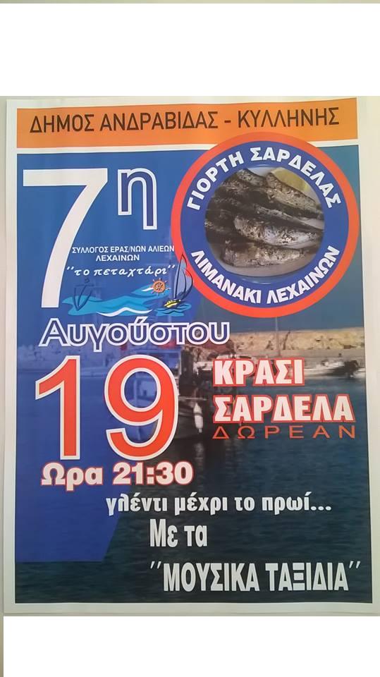 Σε ένα υπέροχο περιβάλλον, στo Αλιευτικό Καταφύγιο Λεχαινών, παρουσιάζει ιδιαίτερο ενδιαφέρον η Γιορτή της σαρδέλας, που διοργανώνεται από τον Δήμο Ανδραβίδας – Κυλλήνης με τη φροντίδα του ΣΥΛΛΟΓΟΥ ΕΡΑΣΙΤΕΧΝΩΝ ΑΛΙΕΩΝ ΛΕΧΑΙΝΩΝ. Η Γιορτή της Σαρδέλας είναι μία γιορτή που καθιερώθηκε τα τελευταία χρόνια και συνεχίζει με όλο και μεγαλύτερη επιτυχία αφού έχει κερδίσει τον κόσμο. Την ημέρα της γιορτής ψήνονται μεγάλες ποσότητες σαρδέλας που προσφέρονται δωρεάν μαζί με κρασί από τα δραστήρια μέλη του Συλλόγου. Συνοδεύεται από ένα «ταξίδι» ζωντανής ελληνικής μουσικής με την ορχήστρα «ΜΟΥΣΙΚΑ ΤΑΞΙΔΙΑ». Το ραντεβού κλείστηκε για τις 9.30 το βράδυ του ΣΑΒΒΑΤΟΥ 19 ΑΥΓΟΥΣΤΟΥ 2017.