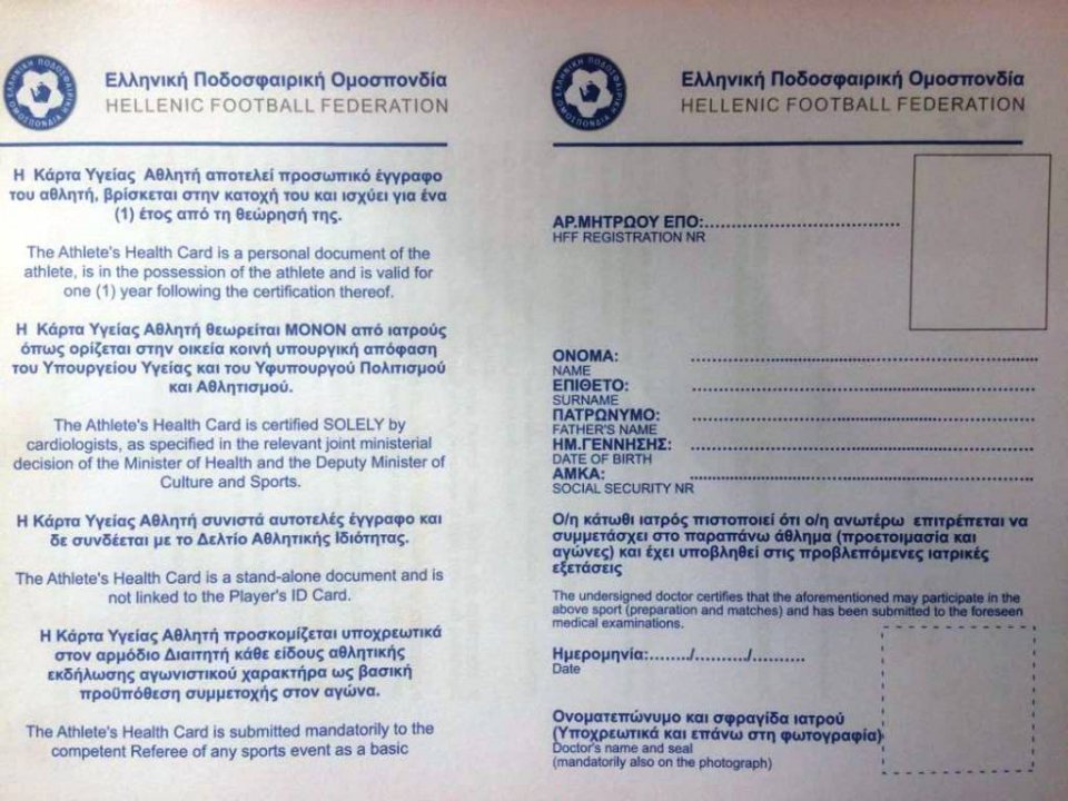 Η Ελληνική Ποδοσφαιρική Ομοσπονδία προχώρησε στην έκδοση της Κάρτας Υγείας Αθλητή, στην οποία θα καταγράφεται η πιστοποίηση της υγείας των αθλητών και θα αποτελεί προϋπόθεση για τη συμμετοχή στις προπονήσεις και στους αγώνες.