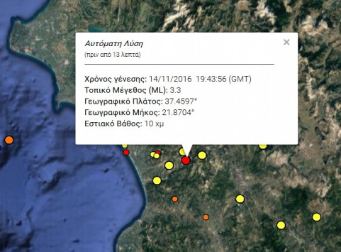 Ο σεισμός έγινε απόψε Τετάρτη 14/11, στις 21:43 και σύμφωνα με την αυτόματη λύση του Γεωδυναμικού Ινστιτούτου ήταν 3,3 ρίχτερ…