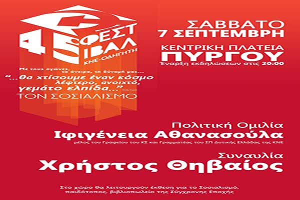 Το Σάββατο 7 Σεπτέμβρη, στην κεντρική πλατεία Πύργου, θα πραγματοποιηθούν οι εκδηλώσεις του 45ου ΦΕΣΤΙΒΑΛ ΚΝΕ-“ΟΔΗΓΗΤΗ” με σύνθημα: Με τους αγώνες, τα όνειρα, τη δύναμή μας… θα χτίσουμε ένα κόσμο λέφτερο, ανοιχτό, γεμάτο ελπίδα… ΤΟΝ ΣΟΣΙΑΛΙΣΜΟ.