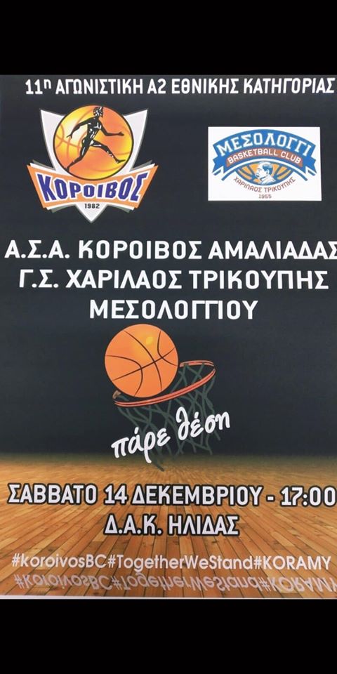 Για την 11η αγωνιστική του πρωταθλήματος μπάσκετ Α2 Εθνικής, το Σάββατο (14/12) ο Κόροιβος Αμαλιάδας αγωνίστηκε εντός έδρας, στο κλειστό Ήλιδας με τον πρωτοπόρο και αήττητο ως τώρα, Χαρίλαο Τρικούπη Μεσολογγίου, από τον οποίο και ήττήθηκε με 68-84 σκορ.