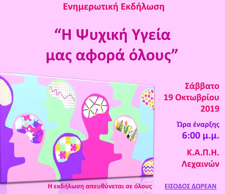 Το Κέντρο Κοινότητας του Δήμου Ανδραβίδας-Κυλλήνης διοργανώνει ενημερωτική ημερίδα με το επίκαιρο και μείζον θέμα “Η Ψυχική Υγεία μας Αφορά Όλους” το Σάββατο 19 Οκτωβρίου 2019 και ώρα 6:00 μ.μ., στην αίθουσα του Κ.Α.Π.Η. Λεχαινών, με αφορμή την Παγκόσμια Ημέρα Ψυχικής Υγείας.