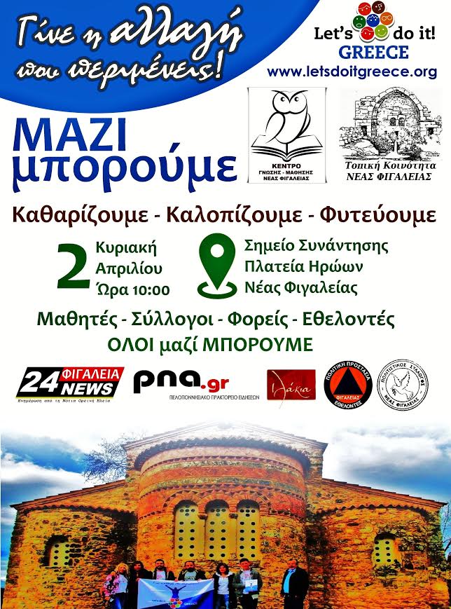 Η Τοπική Κοινότητα Νέας Φιγαλείας μαζί με το Κέντρο Γνώσης Μάθησης της περιοχής συμμετέχουν για 2η συνεχόμενη χρονιά στη πρωτοβουλία αυτή με δράσεις καθαρισμού, καλοπισμού και δεντροφύτευσης της κωμόπολης και προσκαλούν κάθε κάτοικο να βοηθήσει στη δράση αυτή. Την πρωτοβουλία αυτή στηρίζουν ενεργά ο Πολιτιστικός Σύλλογος Νέας Φιγαλείας, οι Εθελοντές Πολιτικής Προστασίας Φιγαλείας, ο Ξενώνας Ιλάκια, το #ΦΙΓΑΛΕΙΑnews24 καθώς και το Πελοποννησιακό Πρακτορείο Ειδήσεων- pna.gr