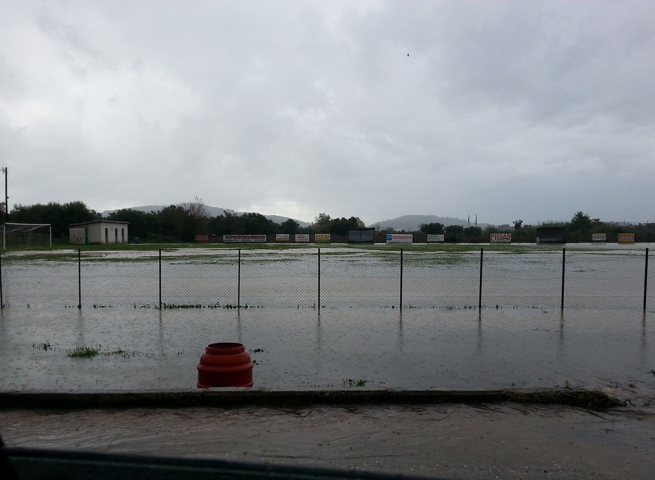 Σε λίμνη έχει μετατραπεί το γήπεδο στην Βροχίτσα Ηλείας από τις σημερινές (Σάββατο) βροχοπτώσεις.