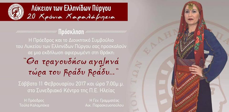 Φέτος το Λύκειο Ελληνίδων Πύργου χορεύει κ τραγουδά τη Θράκη “Θα τραγουδήσω αγαληνα τώρα του βράδυ βράδυ…”, γιορτάζοντας 20 χρόνια Χαραλάμπεια. Το Σάββατο 11 Φεβρουαρίου στις 7 το βράδυ στην αίθουσα της Π.Ε. Ηλείας(Νομαρχία).