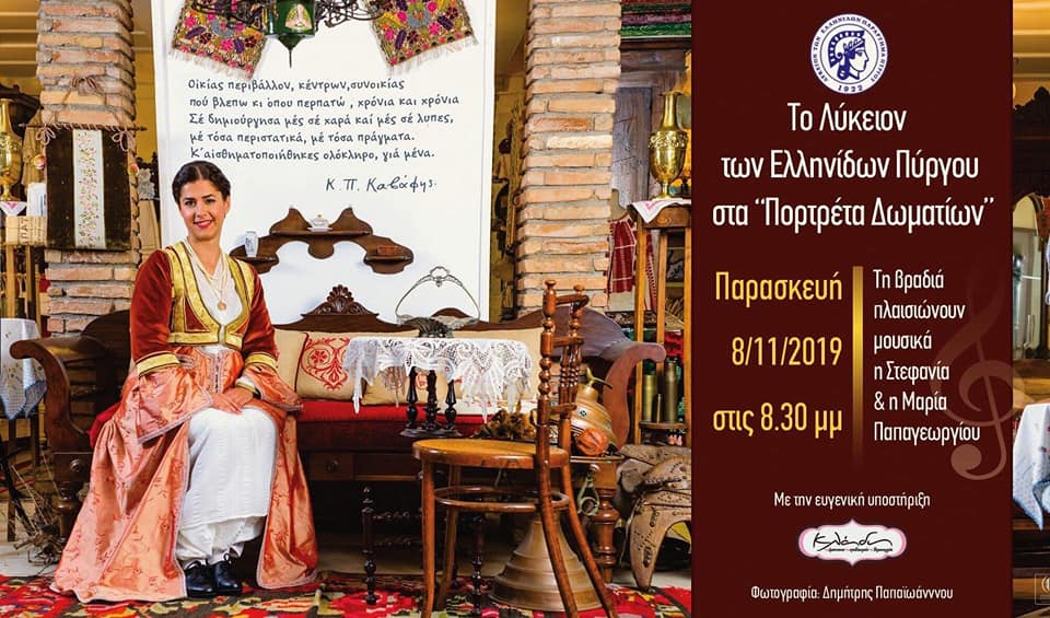 Το Λύκειο των Ελληνίδων Πύργου σε συνεργασία με τα “Πορτρέτα Δωματίων” του Χάρη Κανελλακόπουλου στην οδό Γκοτσίνα στον Πύργο παρουσιάζουν την αστική φορεσιά του Πύργου και άλλες αυθεντικές φορεσιές της ιματιοθήκης μας συνταιριασμένες με τα κεντήματα , τα κιλίμια κ τα πολύτιμα ενθυμήματα μιας άλλης εποχής, την Παρασκευή 8 Νοεμβρίου 2019 και ώρα 8:30μ.μ.