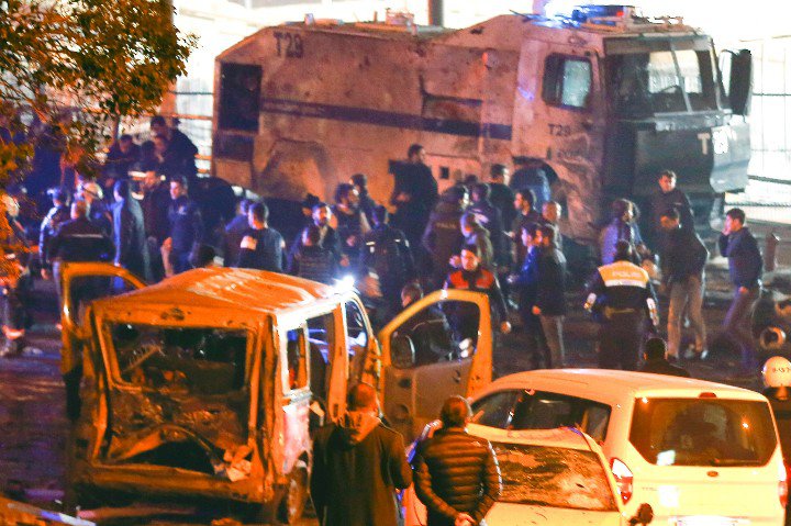 Σε μια επίθεση που ο υπουργός Εσωτερικών της χώρας χαρακτήρισε “συντονισμένες τρομοκρατικές επιθέσεις”, ένα παγιδευμένο φορτηγάκι εξεράγη δίπλα σε κλούβα αστυνομικών (τα αντίστοιχα ΜΑΤ) που ήταν σταθμευμένη δίπλα από το “Vodadone Stadium” της Besiktas, δύο ώρες αφού είχε λήξει ο ποδοσφαιρικός αγώνας που διεξαγόταν εκεί. Την ίδια ώρα ένα βομβιστής αυτοκτονίας πυροδοτούσε το γιλέκο εκρηκτικών που φορούσε σε μικρή απόσταση.