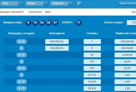 Έναν τυχερό που κερδίζει 600 χιλιάδες ευρώ ανέδειξε η κλήρωση του τζόκερ την τελευταία Κυριακή του Απριλίου. Το τυχερό δελτίο με τις 5+1 επιτυχείς προβλέψεις παίχτηκε στο πρακτορείο του Νικόλαου Ηλιόπουλου, στην Τέμενη Αιγίου. ήταν ένα απλό δελτίο αξίας μόλις 2 ευρώ. Οι τυχεροί αριθμοί ήσαν 8,16,24,30,37 και τζόκερ 17.