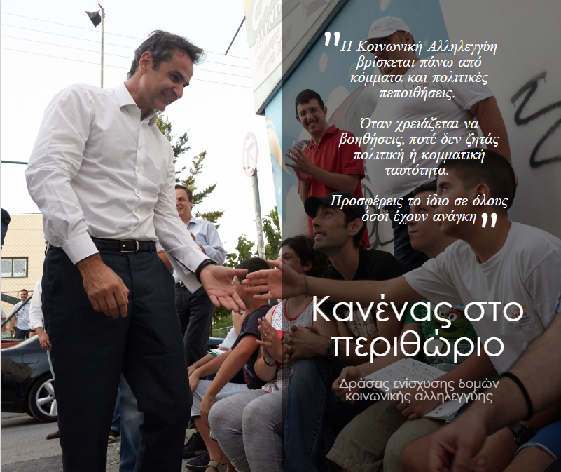 Η Νέα Δημοκρατία αναπτύσσει την δράση «Κανένας στο περιθώριο», με την οποία επιδιώκει να αναγνωρίσει την προσφορά και να βοηθήσειέμπρακτατις δομές Κοινωνικής Αλληλεγγύης και κυρίως οργανώσεις που υποστηρίζονται από μη κρατικούς ή ιδιωτικούς φορείς, όπως η Εκκλησία, φιλανθρωπικά σωματεία, Μ.Κ.Ο.