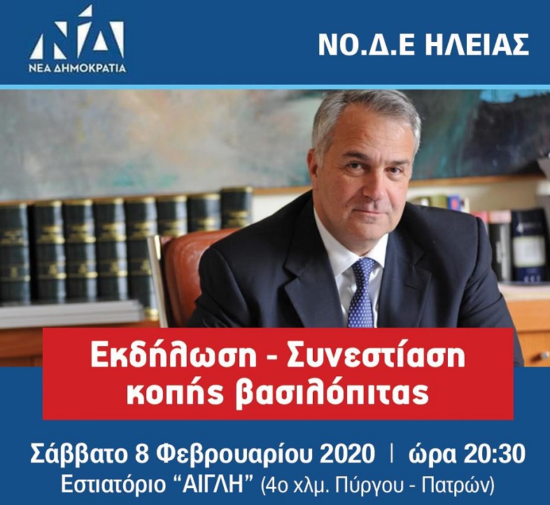 Η ΝΟ.Δ.Ε. Ν.Δ. Ηλείας σας προσκαλεί να τιμήσετε με την παρουσία σας την Εκδήλωση – Συνεστίαση κοπής Βασιλόπιτας που θα γίνει το Σάββατο 8 Φεβρουαρίου 2020 και ώρα 20:30 στο εστιατόριο ΑΙΓΛΗ, που βρίσκεται στο 4ο χιλιόμετρο Πύργου – Πατρών.