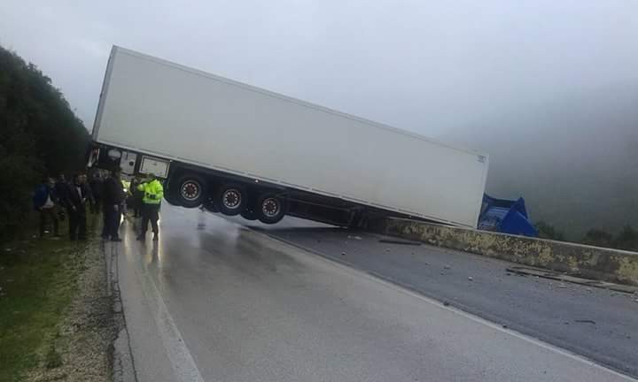 Αποτέλεσμα ήταν το βαρύ όχημα να βρεθεί κάθετα στο οδόστρωμα, με ένα τμήμα του έξω από το προστατευτικό τοιχίο. Στο σημείο έσπευσαν δυνάμεις της τροχαίας και της πυροσβεστικής ενώ χρειάστηκε να κλείσει η Εθνική έως ότου απομακρυνθεί η νταλίκα.