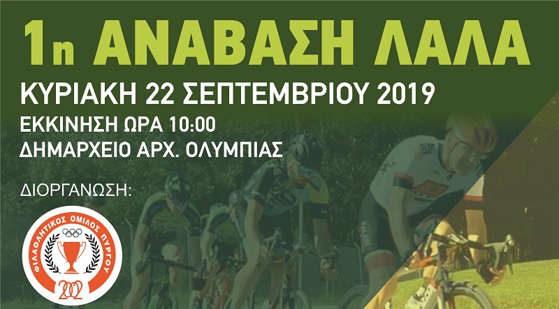 Ένα σημαντικό ποδηλατικό γεγονός αναμένεται να λάβει χώρα την επόμενη Κυριακή 22 Σεπτεμβρίου στην περιοχή της Αρχαίας Ολυμπίας. Πρόκειται για την “1η Ανάβαση Λάλα” ένα αγώνα ανάβασης που θα διεξαχθεί για πρώτη φορά και αναμένεται να συγκεντρώσει το ενδιαφέρον όλου του ποδηλατικού κοινού της περιοχής αλλά και ευρύτερα. Η εκκίνηση θα δοθεί μπροστά από το Δημαρχείο της Αρχαίας Ολυμπίας και περνώντας από τον αρχαιολογικό χώρο και την Ολυμπιακή Ακαδημία θα ανηφορίσει προς το χωριό Μιράκα με στόχο τον τερματισμό στο χωριό Λάλα.Η διαδρομή πανέμορφη και πέραν της ιστορικότητας του μέρους θα αποζημιώσει τους συμμετέχοντες με το φυσικό της κάλλος και την ποιότητα του οδοστρώματος.Οι κατηγορίες που θα έχει ο αγώνας θα είναι: Άνδρες/Νέοι, Γυναίκες, Νεάνιδες, ‘Έφηβοι, Μάστερς(όλες) ΟΠΕΝ (19+ ΕΤΩΝ). Στους πρώτους των κατηγοριών που θα συμπληρωθούν με 6 συμμετέχοντες σε κάθε κατηγορία θα δοθεί χρηματικό έπαθλο και κύπελλο ενώ θα δοθούν μετάλλια και διπλώματα σε όσους συμπληρώσουν την 6άδα των νικητών της κατηγορίας. Ο αγώνας θα εκκινήσει με όλες τις κατηγορίες του ταυτόχρονα στις 10πμ ενώ η γραμματεία για την παραλαβή αριθμού και δήλωση συμμετοχής θα είναι ανοικτή από τις 8πμ. Οι χορηγοί της διοργάνωσης είναι οι: “ΠΑΡΡΑΣ” ηλεκτρικές συσκευές , και “BEVOUDAS” Group of Companies ενώ πολύτιμη η συμβολή των Σαμαρειτών Αμαλιάδας, της Διασωστικής Ομάδας Ηλείας και την ΜΟΤΟΛΕΑ.Για πληροφορίες σχετικά με τον αγώνα στο τηλ 6945701052 Κον Τσόκο Παναγιώτη.