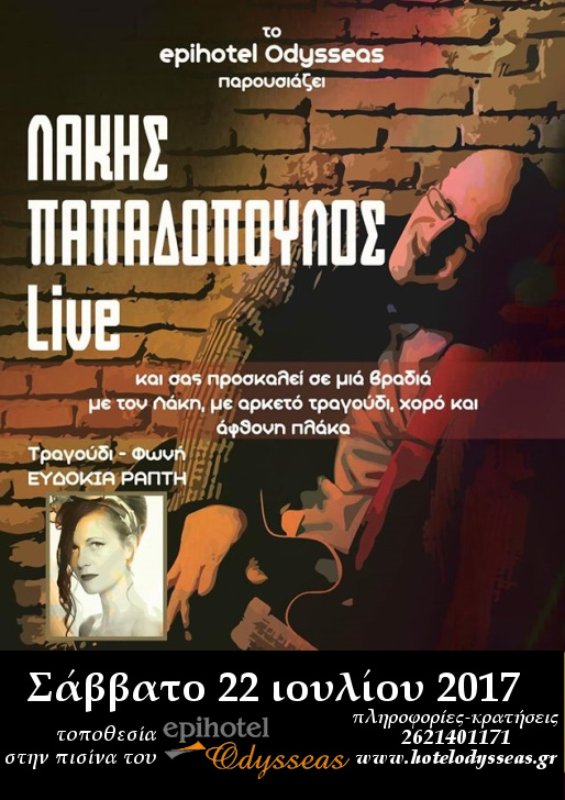 Για δεύτερη συνεχόμενη χρονιά ο Λάκης Παπαδόπουλος έρχεται για μία και μοναδική βραδιά, να τραγουδήσει σ’ ένα μαγευτικό περιβάλλον στην πισίνα του ξενοδοχείου Οδυσσέας, στις 22 Ιουλίου 2017 και ώρα 22:30. Μαζί με την Ευδοκία Ράπτη, θα τραγουδήσουν επιτυχίες του, όπως τη «Γυριστρούλα», το «Τσίχλα δίχως ζάχαρη», το «Παλτό» κ.ά