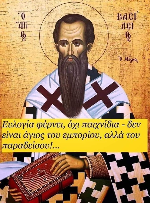 Κοιτάξτε τα αθώα παιδικά βλέμματά τους, τα οποία συνηθίζουν στην αυταπάτη και εξηγήστε τους πλέον ότι τα δώρα την νύκτα της Πρωτοχρονιάς δεν τα φέρνει «μαγικά» ο ανύπαρκτος Άγιος Βασίλης του εμπορίου, που είναι μία ακόμη καλοστημένη παγίδα από την νέα τάξη πραγμάτων και την παγκοσμιοποίηση, που βέβαια έχει σκοπό μοναδικό την εκκοσμίκευση, την εκδυτικοποίηση και αλλοτρίωση των Ορθοδόξων Ελλήνων Χριστιανών, αλλά πέστε τους ξεκάθαρα ότι τα προσφέρετε εσείς οι γονείς, οι παππούδες, οι γιαγιάδες, οι ανάδοχοι και οι συγγενείς σας, από τον τίμιο ίδρωτά σας και έτσι θα σας αγαπήσουν ακόμη περισσότερο!