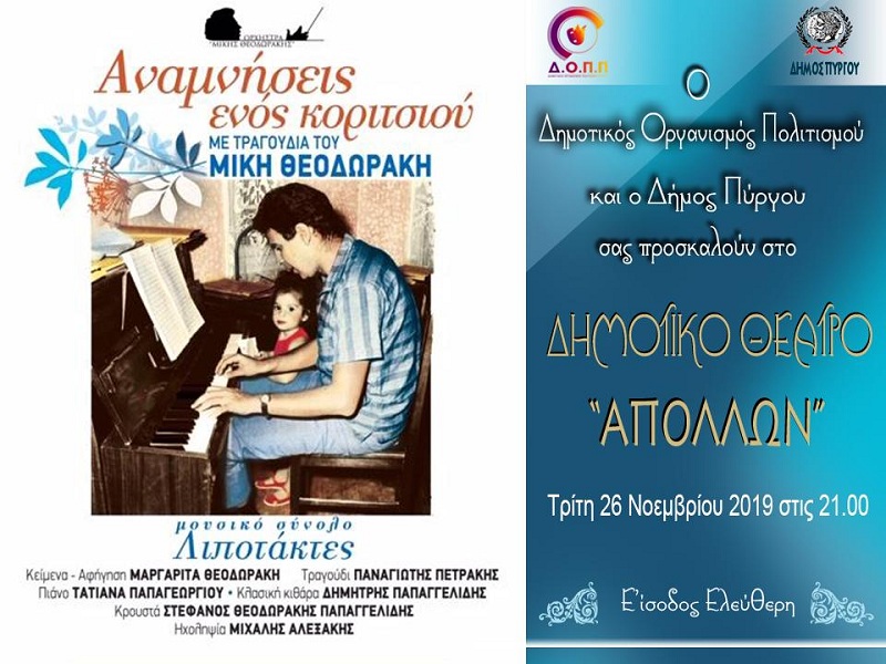 * Την Τρίτη 26 Νοεμβρίου 2019 στα πλαίσια αυτής της δράσης οι «Λιποτάκτες» το μικρό μουσικό σύνολο της ορχήστρας «Μίκης Θεοδωράκης» θα δώσει συναυλία στο δημοτικό θέατρο «Απόλλων» του Πύργου με τίτλο «Αναμνήσεις ενός κοριτσιού» με τραγούδια του Μίκη Θεοδωράκη. Συμμετέχουν: