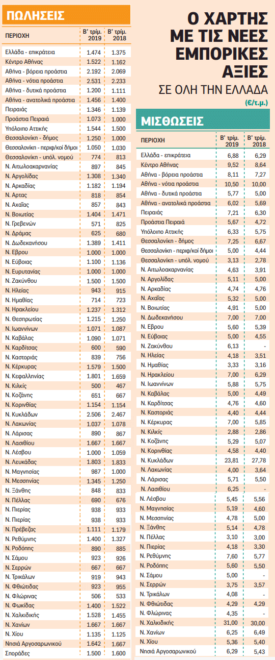 Συγκριτικά µε την αντίστοιχη περίοδο του 2018, τη µεγαλύτερη αύξηση ζητούµενων τιµών παρουσιάζει, σε πανελλαδικό επίπεδο, το κέντρο της Αθήνας µε ποσοστό 30,90%, στα 1.474 ευρώ το τετραγωνικό µέτρο. Ακολουθεί η Θεσσαλονίκη µε 25% (1.250 ευρώ/τ.µ.), µε τον Πειραιά να καταλαµβάνει την τρίτη θέση µε άνοδο 18,20% (1.346 ευρώ/τ.µ.). Κατά το ίδιο διάστηµα, σηµαντική άνοδο καταγράφουν τα ενοίκια που ζητούν ιδιοκτήτες και διαχειριστές ακινήτων.